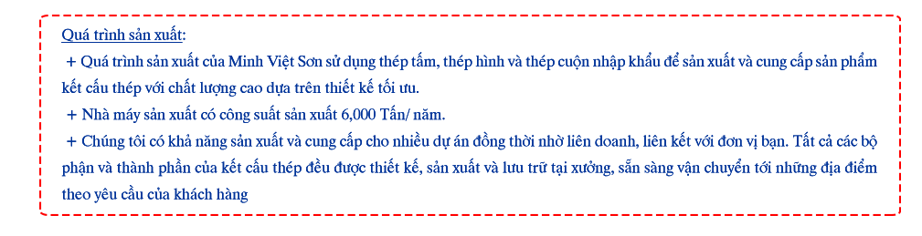 Với đội ngũ nhân lực gồm hơn 120 cán bộ công nhân viên được đào tạo chuyên nghiệp, hệ thống quản lý chất lượng .... cùng hệ thống nhà máy sản xuất có diện tích 8000 m2, 500 tấn kết cấu thép/tháng, chuyền sản xuất tự động công nghệ cao, Minh Việt Sơn tin tưởng sẽ cung cấp những giải pháp tối ưu, sản phẩm chất lượng cao và dịch vụ hoàn hảo nhất cho dự án của quý khách.