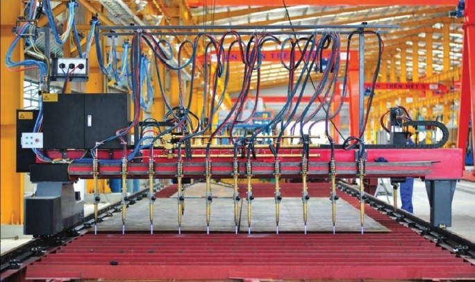- Cắt thép bằng máy cắt tự động CNC, có thể cắt theo thiết kế bất kỳ hình dạng cần cắt. Tất cả các tấm được cắt thành kích thước yêu cầu bằng nhiệt độ cực nóng có khả năng cắt tấm thép có bề dày lên đến 80mm.
