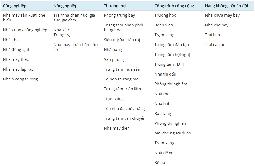 Do những ưu điểm kể trên của nhà tiền chế nên kiểu nhà này được ứng dụng rộng rãi và đa dạng ở nhiều loại công trình khác nhau, từ nhà kho đến nhà chứa máy bạy với khẩu độ lên đến 100m không cột giữa. Với độ dài nhịp có thể lên đến hơn 100m, nhà tiền chế có thể được sử dụng ngay tại những công trình mà các loại nhà bê tông cốt thép khó có thể đáp ứng được với mức chi phí tối ưu hơn rất nhiều. Hơn nữa, đây thực sự là loại nhà lý tưởng để sử dụng làm nhà xưởng, nhà kho, nhà trưng bày và siêu thị. Và nhà tiền chế cũng đang dần lấn sân sang những lĩnh vực dân dụng vốn không được ưa chuộng lắm trước đây